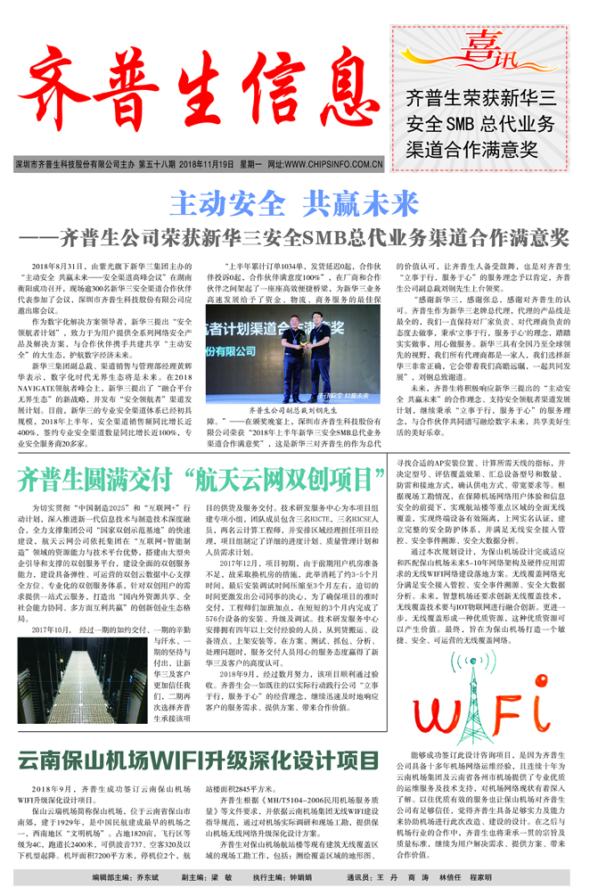主動安全 共贏未來 ——齊普生公司榮獲新華三安全SMB總代業務渠道合作滿意獎
